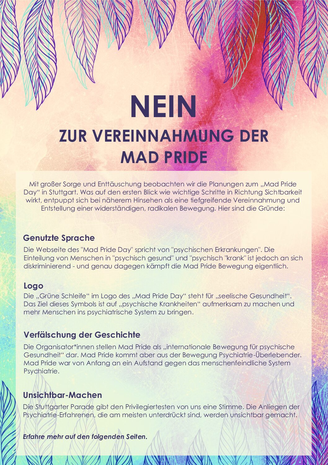 Gleichzeitig nutzen wir diese Stellungnahme, um zum Abschluss Überlegungen und Vorbereitungen zum Mad Pride Day in Stuttgart transparent zu machen – und somit Ideen, Kritik und Reflektionen anzustoßen. Schreibt uns gerne, wenn ihr Gedanken dazu habt!